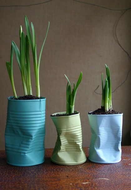 Colorare i barattoli di alluminio e poi sformarli un po’. Della terra e delle piante che crescono senza difficoltà nei contenitori angusti. La semplicità nell’arredo è servita!