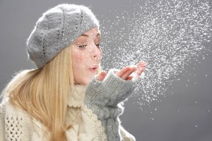 Teenage Girl Wearing Warm Winter Clothes And Hat Blowing Snow In Studio
