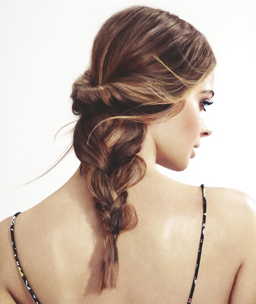 Realizzate una coda di cavallo senza tirarla troppo. Apritela al centro e fatevi passare dentro le lunghezze. Adesso intrecciate le lunghezze e fissatele con un mini elastico invisibile. A questo punto dovete “spettinare” la treccia allargandola con le mani in modo che nella zona superiore sia più morbida e la parte finale resti ben stretta.