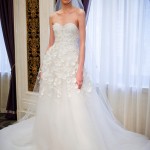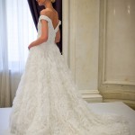Ci piace infine sottolineare la delicatezza delle scollature, ispirate ai corpetti da ballerina con taglio profondo a V e a cuore, e con spalline sottilissime. E anche sulla schiena gli abiti hanno scollature profonde, anche ad effetto tattoo. E per quanto riguarda le decorazioni, notiamo ancora un prepotente utilizzo del pizzo a disegni floreali e dei fiori di tessuto applicati alle gonne, fino ad arrivare all’abito da sposa in cui il tessuto della gonna crea dei disegni che somigliano alle rose.