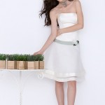 Tessuti tradizionali come il mikado e l’organza si uniscono a quelli “Country Chic” più grezzi come la garza. Questa mescolanza crea un mood naturale e chic e gli abiti bianchi si arricchiscono di una sfumatura delicata di verde salvia, che ricorda l’ambiente naturale dei campi di erbe aromatiche. Ci sono abiti da sposa essenziali dalle linee semplici, con dettagli in verde come la cintura. Ci sono anche abiti più divertenti e spiritosi, con gonna corta e vaporosa in organza rosa di seta, con cintura alla vita color salvia e scollo totale.