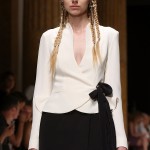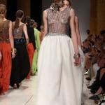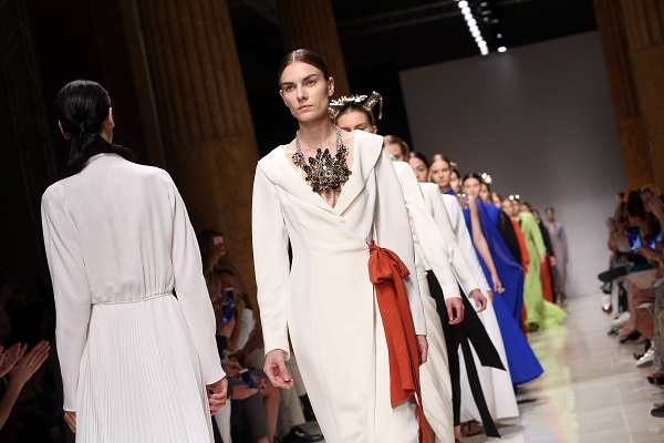 Amaranto, blu Cina, verde acido, questi sono i colori utilizzati in passerella da Luigi Borbone che ricordano i toni delle più antiche porcellane orientali e suggeriscono ambientazioni senza tempo e in certi momenti senza luogo. Allo stesso modo volumi morbidi e scivolati, tagli geometrici raccordati da fiocchi e nastri che chiudono gli abiti, giacche e vestiti morbidi come vestaglie, esaltano una silhouette di una donna d’altri tempi resa moderna dall’utilizzo di colori accesi.