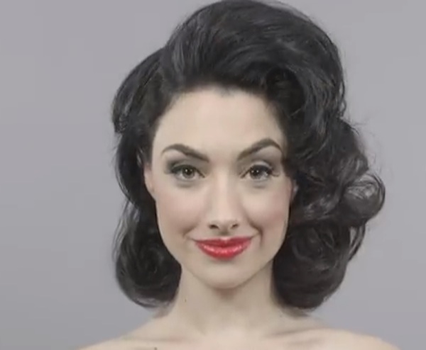 Capelli gonfi raccolti sulla nuca, volume e lunghezza, ombretto verde e rossetto rosa: è il canone estetico della donna del 1960 che ricorda Brigitte Bardot.