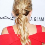 1) Coda di cavallo cotonata. Ashley Tinsdale la indossa con disinvoltura e in effetti questa pettinatura ha un’aspetto molto dinamico, che la rende perfetta per ogni occasione. La coda è leggermente più in alto della nuca, liscia sulla fronte e cotonata sul retro. Due ciocche di capelli si avvolgono attorno all’elastico per nasconderlo. Una semplicissima fascia sottile di pelle nera completa l’acconciatura.
