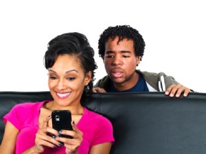 distrusting couple snooping on cell phone text messages