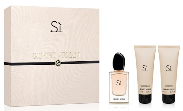 È l’ultima fragranza femminile nata in casa Armani: testimonial è l’australiana Cate Blanchett, due volte premio Oscar, che interpreta un profumo femminile, ma ideato per una donna decisa e sicura di sé, sensuale e intrigante. Lo speciale cofanetto regalo (prezzo 85,00 euro) comprende l’Armani Sì Eau de Parfum (50ml spray), l’Armani Sì Gel Doccia (75ml), l’Armani Sì Latte Corpo (75ml).