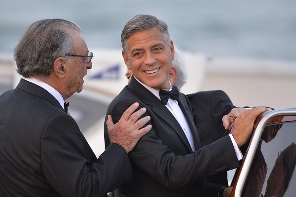 US actor George Clooney (R) is pictured with his father in law Ramzi Alamuddin on a taxi boat after he leaves the Cipriani hotel on September 27, 2014 in Venice where Clooney and British fiancee, Amal Alamuddin celebrate their wedding. George Clooney has said goodbye to bachelorhood in Venice with a stag party at his favourite restaurant with Hollywood chums, and was gearing up for a day of glamourous pre-wedding celebrations. The actor had swept into the floating city yesterday with his British fiancee Amal Alamuddin on a watertaxi dubbed “Amore”, zipping up the Grand Canal to cheers from fans at the start of nuptials set to draw out over the weekend. AFP PHOTO / ANDREAS SOLARO (Photo credit should read ANDREAS SOLARO/AFP/Getty Images)