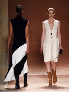 Models present creations by designer Victoria Beckham during the Mercedes-Benz Fashion Week Fall 2015 in New York on February 15, 2015. AFP PHOTO/JEWEL SAMAD (Photo credit should read JEWEL SAMAD/AFP/Getty Images)