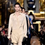 Animalista e vegana, come ormai tutti sappiamo, Stella McCartney non poteva non inventare un nuova pelliccia-non pelliccia, di lana molto pelosa ma inframmezzata da tasselli tessuti grossolanamente (questa è la novità), presentata in total white con tanto di colbacco ecologico. Le lunghissime collane di perle a spirale sono il decoro dei completi a spalle nude per la sera, neri oppure molto chiari, con i pantaloni che si allargano in perfetto stile anni 70.