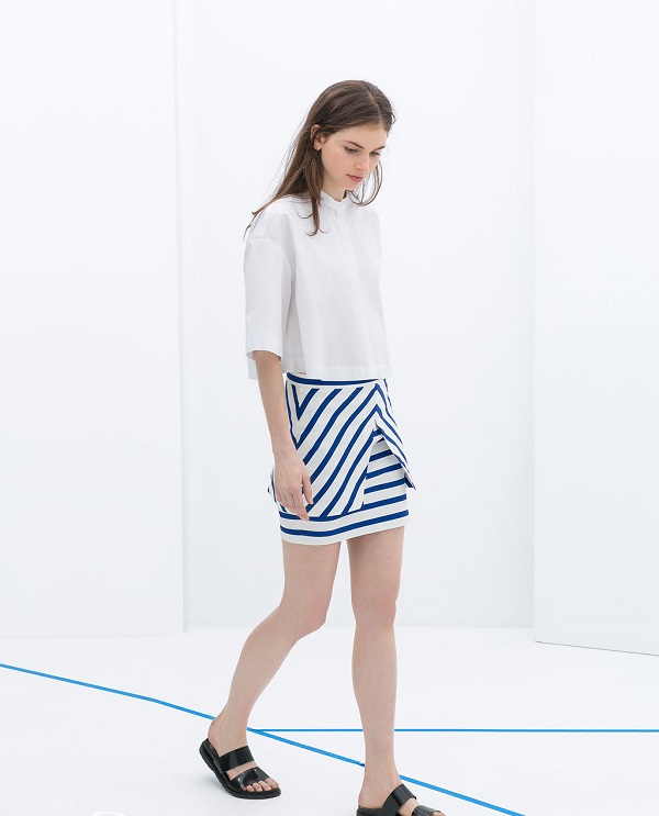 • Zara propone la gonna a righe bianche e azzurre in un modello assolutamente anni ’90. Retta sotto e a portafoglio sopra, presenta due varietà di stripes: orizzontali nella parte inferiore, oblique nella parte superiore.