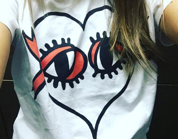 La t-shirt è decorata con un grande cuore stilizzato che contiene due occhi composti dal nastrino rosso che rappresenta il simbolo stesso della lotta all’AIDS. Ricorda un po’ le illustrazioni di Keith Haring e una lunga tradizione di street-art, qui al servizio di una buona causa. I proventi delle vendite infatti vanno interamente ad UNAIDS e alle sue iniziative. Tra le altre l’hanno indossata Miroslava Duma, Eva Longoria e Camille Charrière.