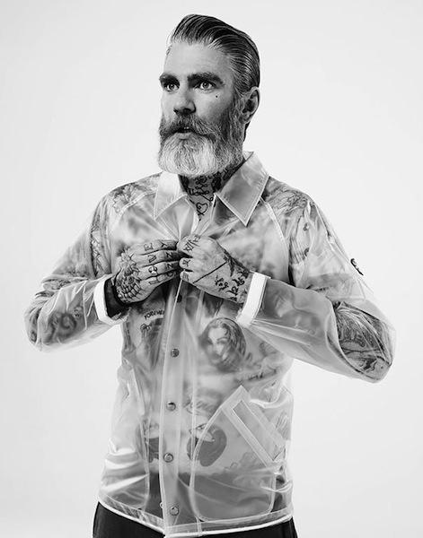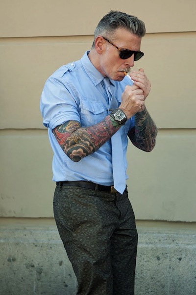 L’affascinante uomo che si accende la sigaretta con il volto coperto da occhiali da sole e i baffi svela con naturalezza le braccia pluritatuate che spuntano dalle maniche arrotolate della camicia.