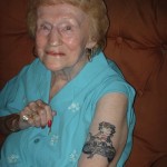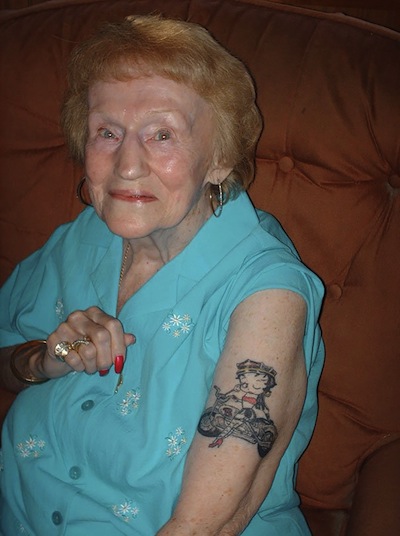 La bionda signora con il drago colorato tatuato sul fianco sembra essere perfettamente a suo agio anche mezza nuda, la nonnina sfoggia sul braccio il tatoo di Betty Boop in motocicletta.