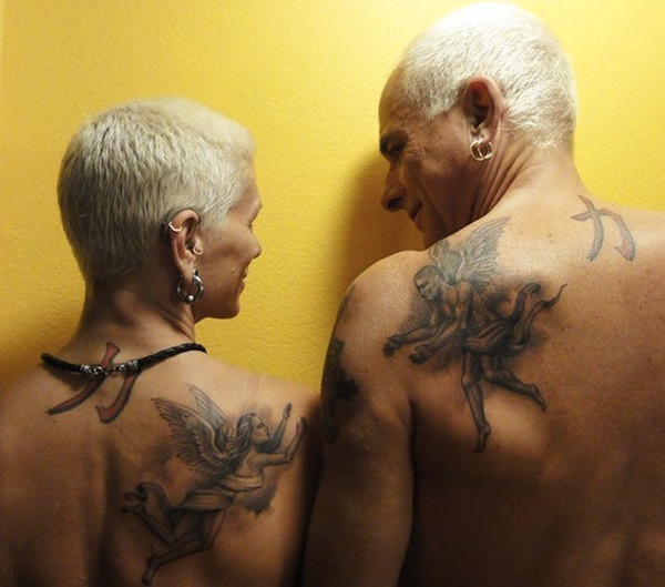 Non mancano poi le coppie pluritatuate avvinghiate con dolcezza o chi ha voluto creare un tatuaggio da condividere con l’altro (gli angeli sulla spalla che volano l’uno verso l’altro).