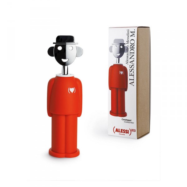 La risposta maschile al successo del cavatappi “Anna G.” è il cavatappi “Alessandro M.” che indossa un abito rosso con un cuore bianco circondato dalle parentesi (RED) sulla parte anteriore e il logo (PRODUCT)RED nella parte posteriore in basso.