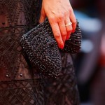 Maria Grazia Cucinotta non rinuncia invece a un tocco di smalto rosso fiammante a contrasto con un look total black con clutch in paillettes.